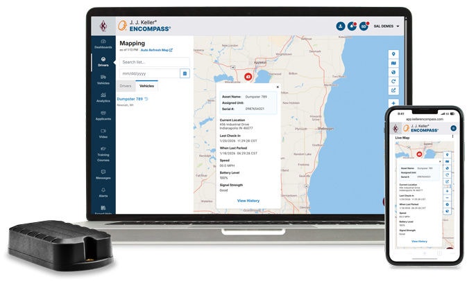 The Encompass® Asset Tracking Solution featuring the J. J. Keller® AT100 tracking device gives you full visibility to the location of your company trailers, equipment and other units, so you always know where they are without the time-consuming hassle of searching. The solution is fully integrated with the Encompass® Fleet Safety & Compliance Platform to seamlessly help protect your equipment and improve asset management.