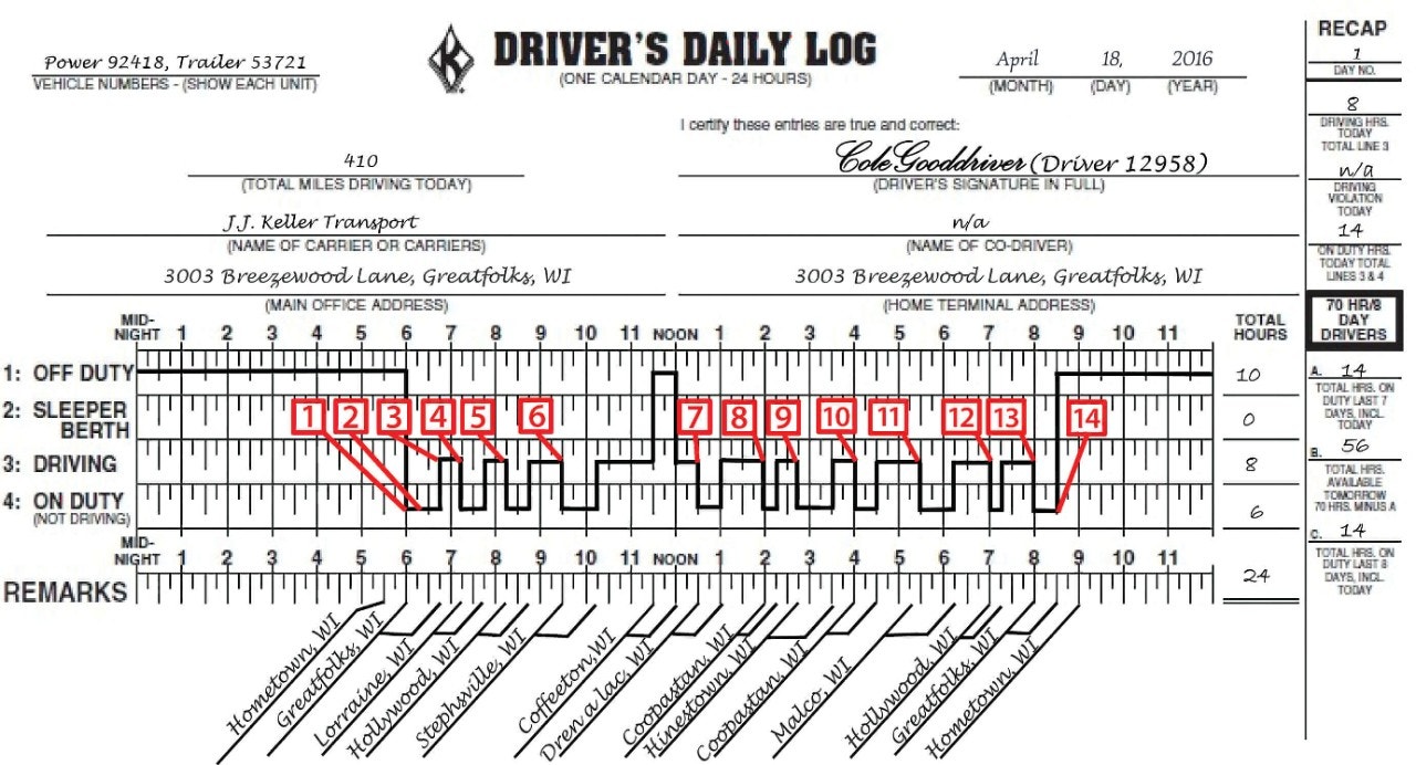 1– 06:00 Drives his CMV from home to the terminal and in-gates into the facility. His carrier keeps a gate record.